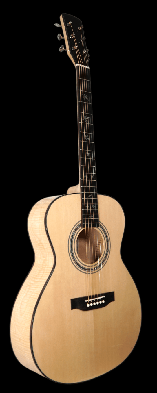 All solid 000-size guitar with fine spruce top, mahogany body, 1-piece mahogany neck with ebony fingerboard and a professional Shadow pickupsystem. Nice vintage sunburst finish.