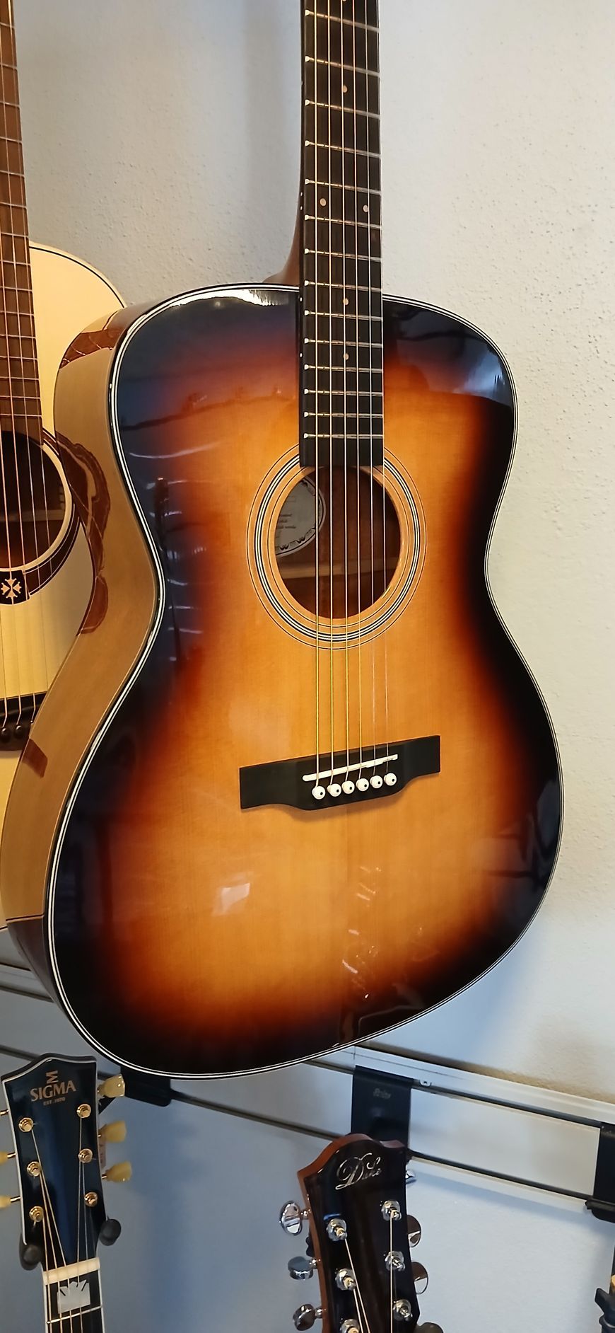 A really nice and warm sounding guiitar for low price: Grand Auditorium with a solid spruce top and tilia mahogany body, Sigma preamp system and a wirde neck. Cool!