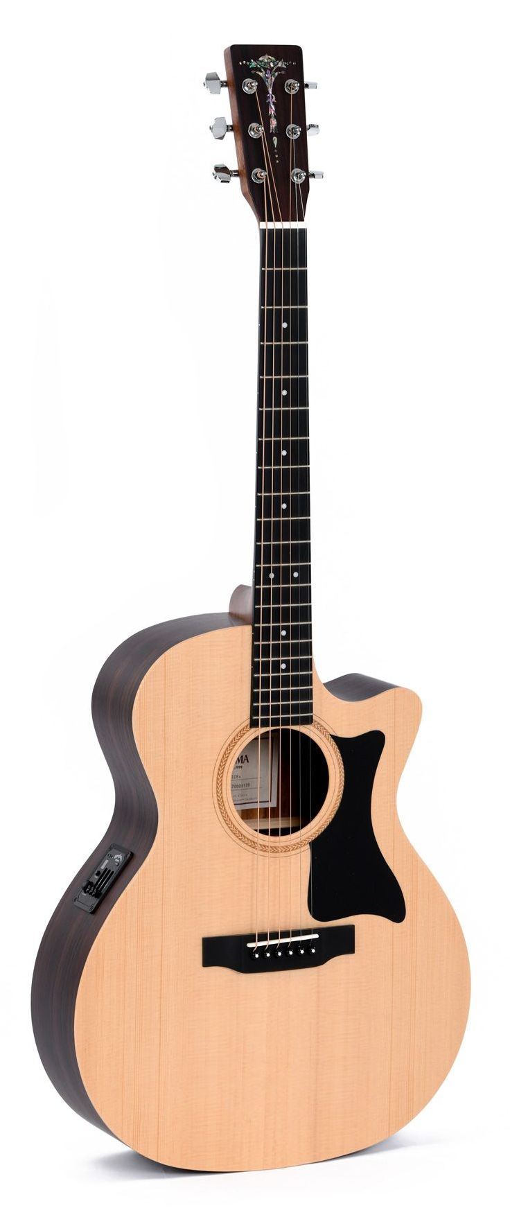 All solid 000-size guitar with fine spruce top, mahogany body, 1-piece mahogany neck with ebony fingerboard and a professional Shadow pickupsystem. Nice vintage sunburst finish.